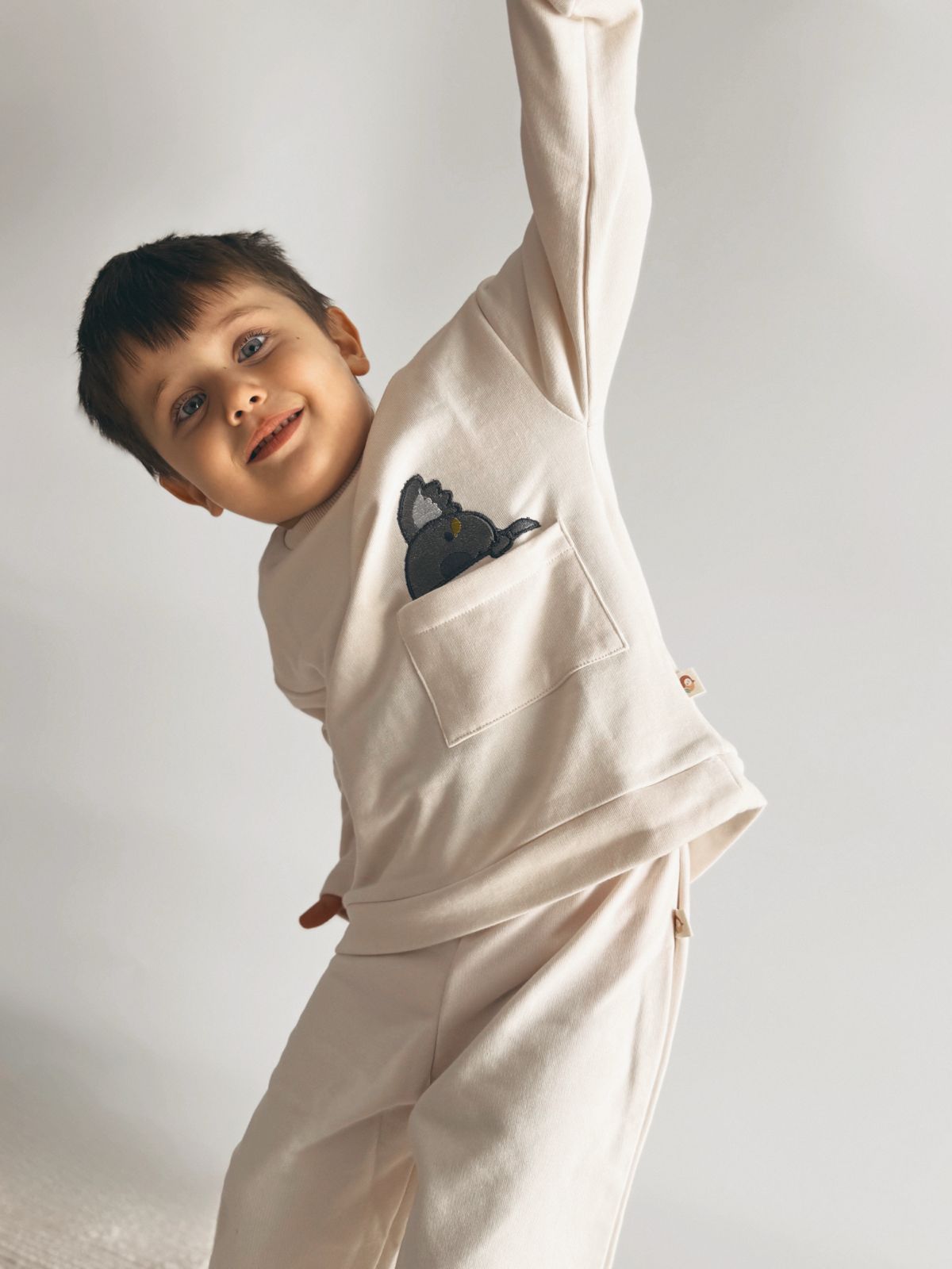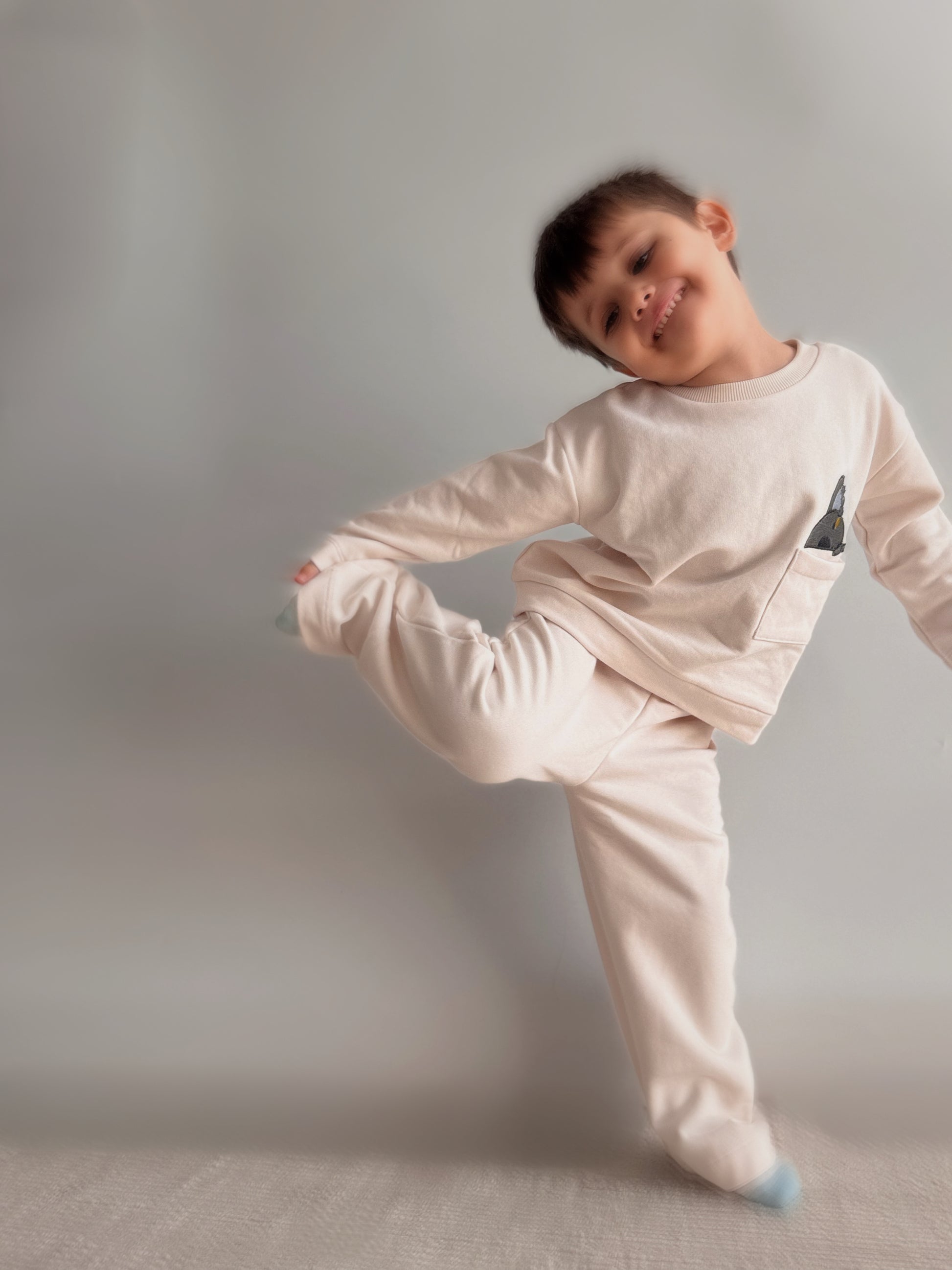 Cloud Sweat & Pant, çocukların gün boyu özgürce hareket etmesi için konforu ve şıklığı bir araya getirir. Yumuşak dokusu ve minimal tasarımıyla günlük kullanımda vazgeçilmez bir parça. Sevimli cep detayındaki kuş motifi ise takıma eğlenceli bir dokunuş katar.