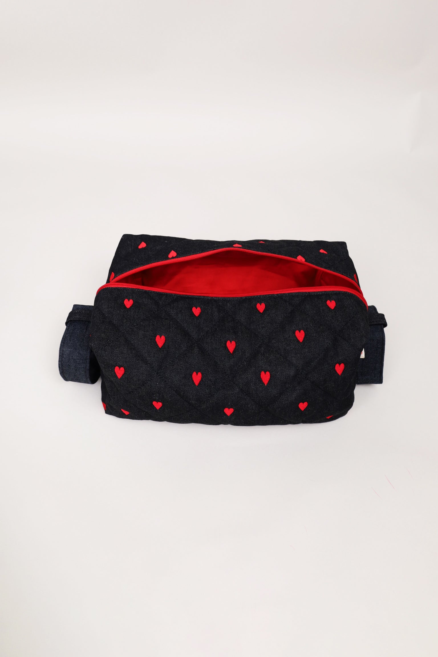 Kırmızı kalp nakış desenli,kontrast kırmızı fermuarlı