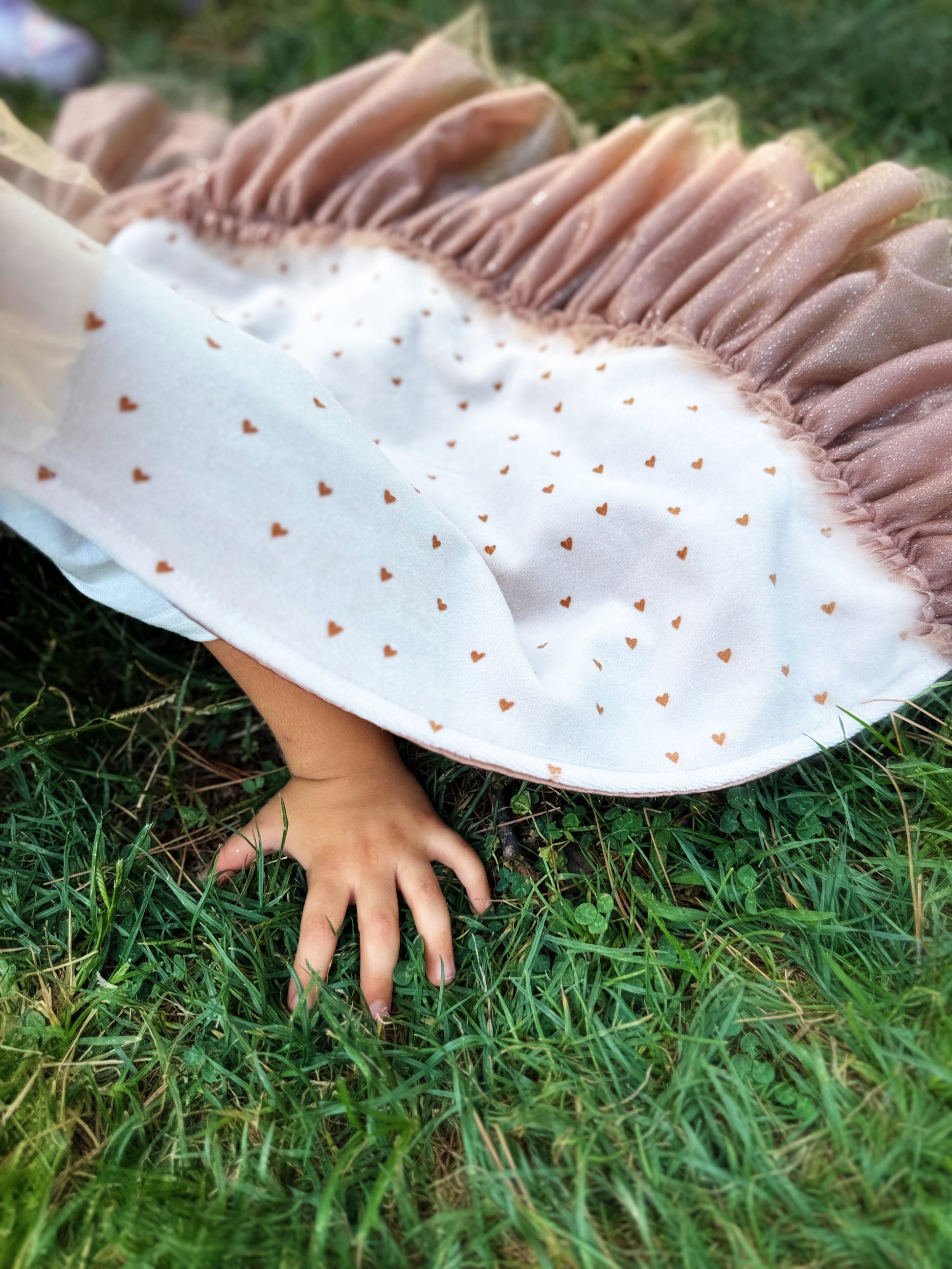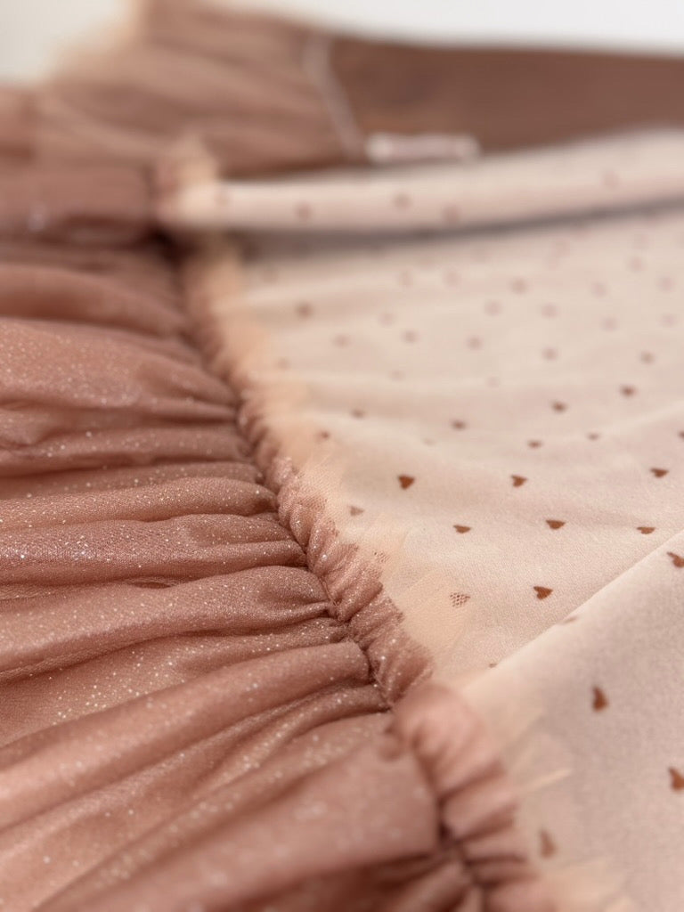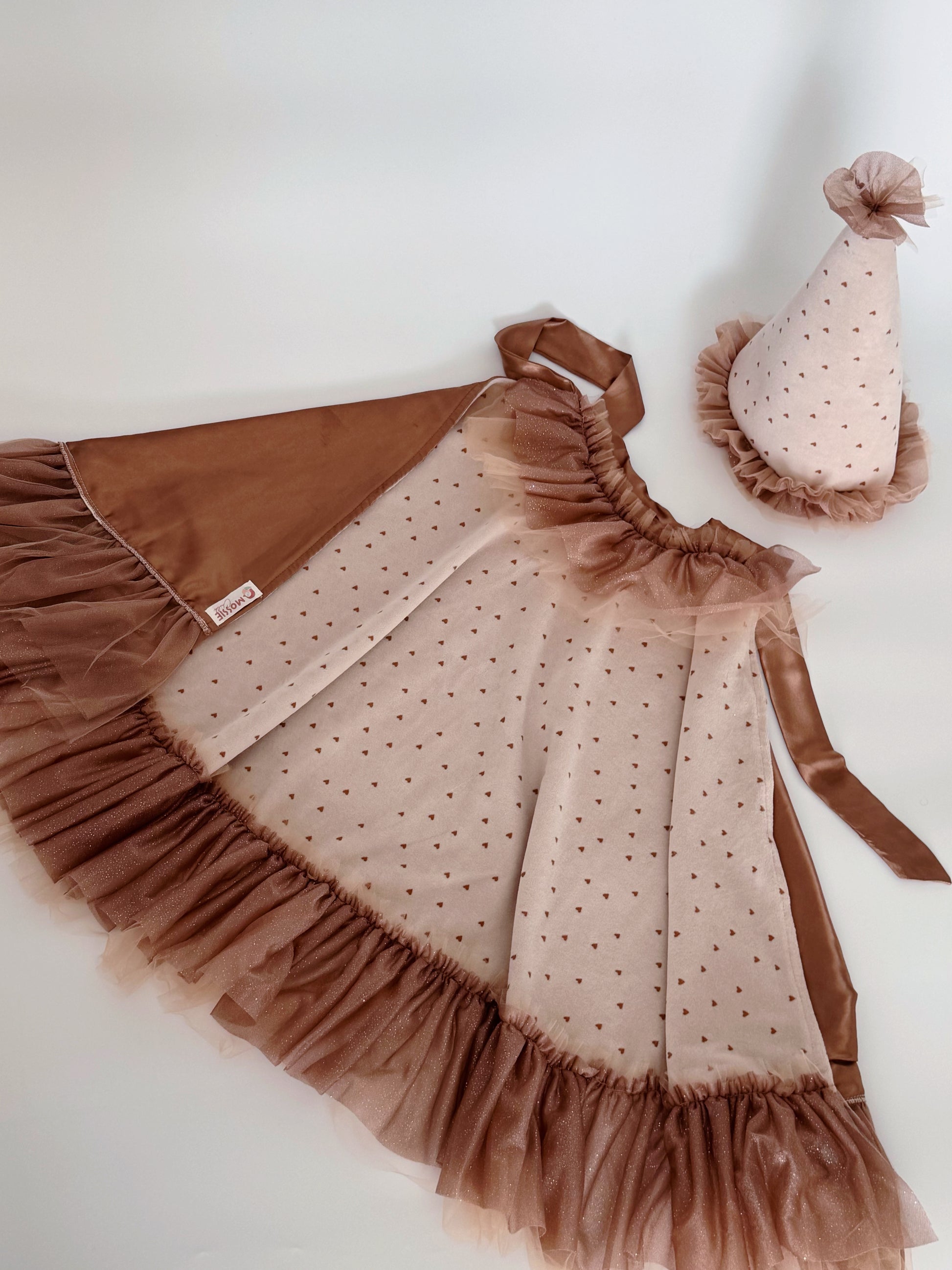 Kalp detaylı tülünün zarif ışıltısı, etek ucundaki yumuşak volanlarla birleşerek küçük büyücünüzün adımlarına hafiflik ve büyü katar. İç kısmındaki sıcak çikolata tonlarındaki yumuşacık kumaş, şıklığı konforla buluşturur.