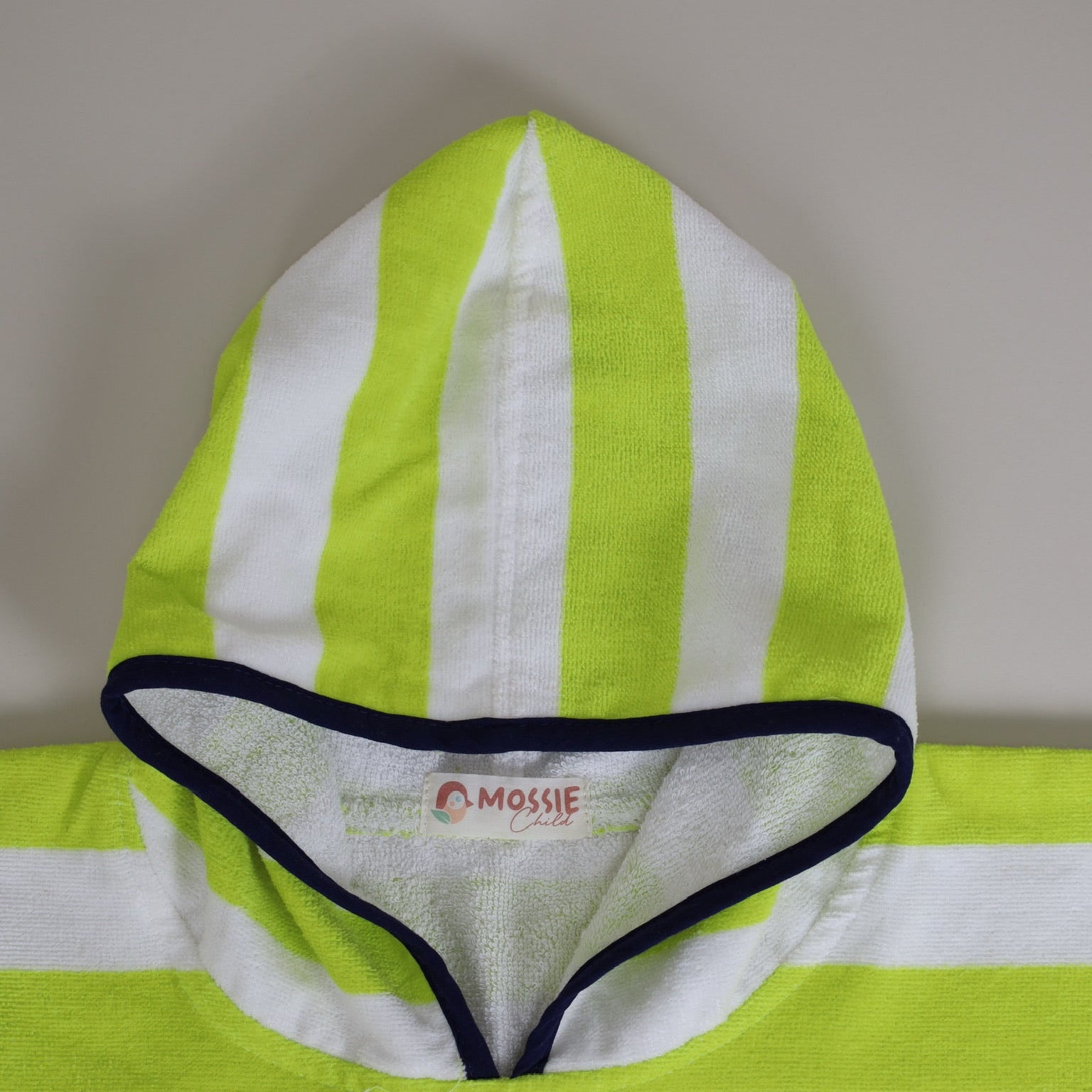 Sunny Splash Shark Poncho Green, Canlı yeşil–beyaz çizgileri ve sevimli köpekbalığı nakışıyla bu panço, yazın en eğlenceli anlarına eşlik etmeye hazır! %100 pamuk havlu dokusu sayesinde suyu hızla emerek çocuğunuzu hem plaj ve havuzdan sonra hem de evde banyodan sonra konforla sarar.